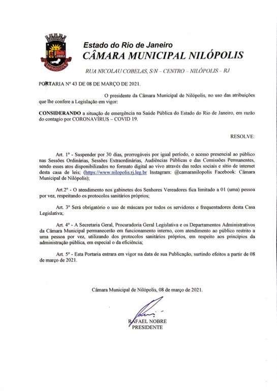 Tendo em vista a situação de emergência na saúde Pública do Estado do Rio de Janeiro, em razão do contágio por CORONAVÍRUS / COVID-19, o presidente da Câmara Municipal de Nilópolis, vereador Rafael Nobre, assinou Portaria Nº 43, de 08 de março de 2021, com diversas providências a serem adotadas no funcionamento da Câmara.